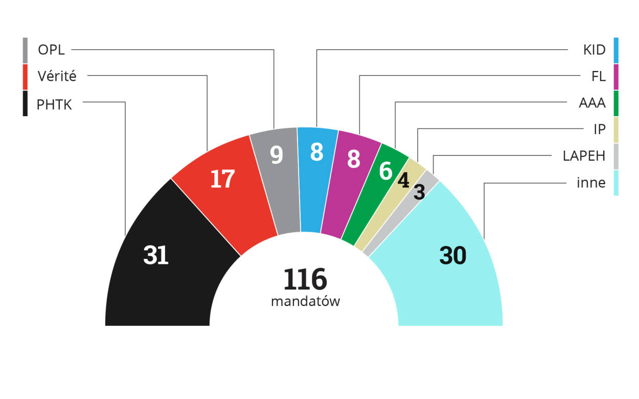 Podział mandatów po wyborach do Izby Deputowanych z 9 sierpnia 2015 r., 25 października 2015 r. i 20 listopada 2016 r.: PHTK 31, Vérité 17, OPL 9, KID 8, FL 8, AAA 6, IP 4, LAPEH 3, inne 30. Razem 116.