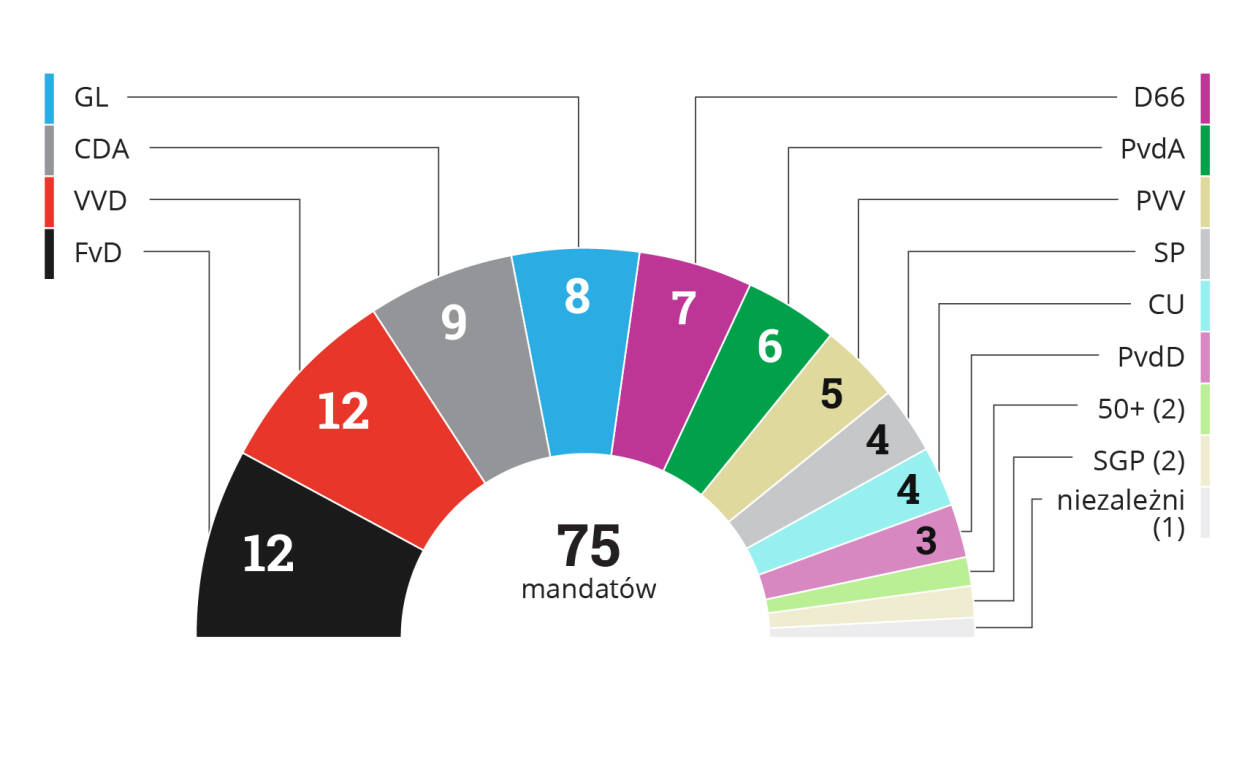 Podział mandatów po wyborach z 27 maja 2019 r.: FvD 12, VVD 12, CDA 9, GL 8, D66 7, PvdA 6, PVV 5, SP 4, CU 4, PvdD 3, 50+ 2, SGP 2, niezależni 1. Razem 75.