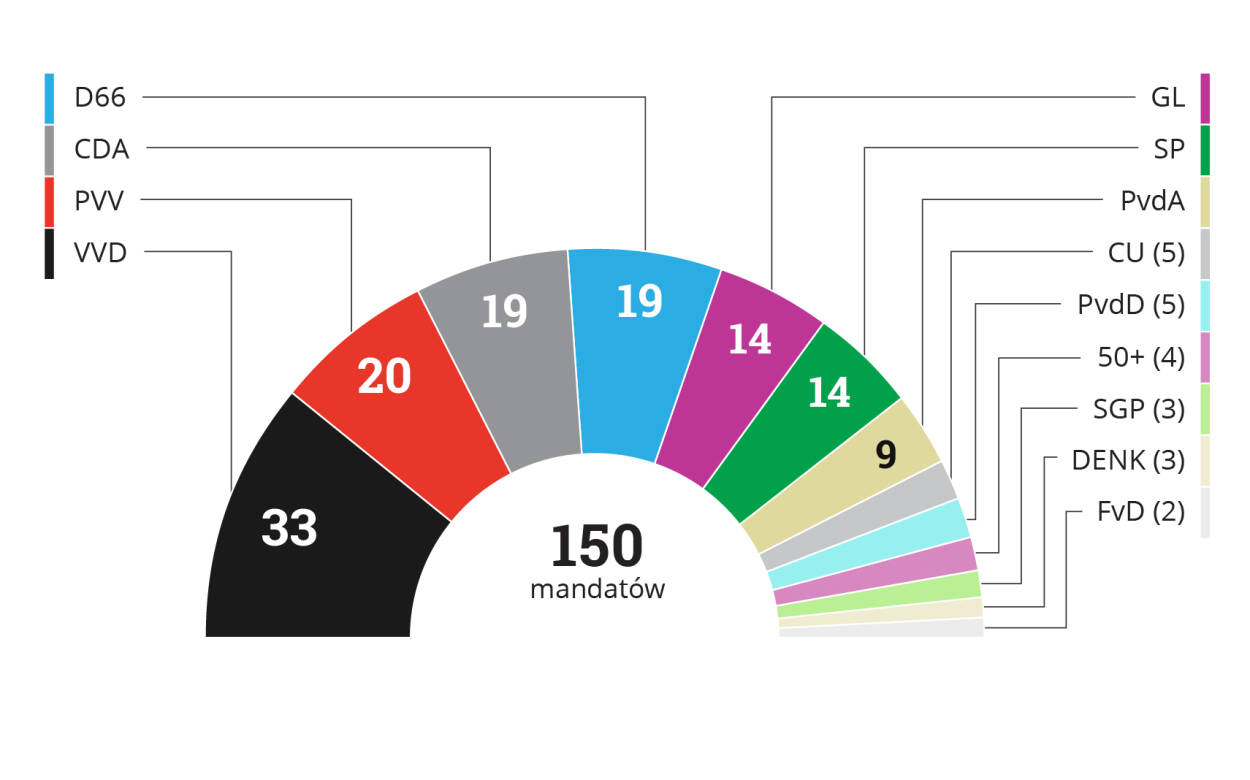 Podział mandatów po wyborach z 15 marca 2017 r.: VVD 33, PVV 20, CDA 19, D66 19, GL 14, SP 14, PvdA 9, CU 5, PvdD 5, 50+ 4, SGP 3, DENK 3, FvD 2. Razem 150.