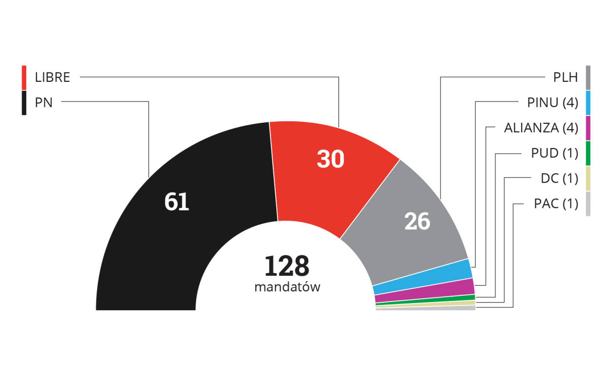 Podział mandatów po wyborach z 26 listopada 2017 r.: PN 61, LIBRE 30, PLH 26, PINU 4, ALIANZA 4, PUD 1, DC 1, PAC 1. Razem 128.