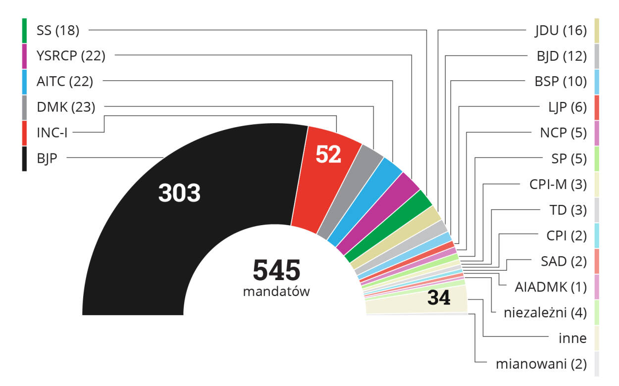 Podział mandatów po wyborach z 11, 18, 23, 29 kwietnia 2019 r. oraz 6, 12 i 19 maja 2019 r.: BJP 303, INC-I 52, DMK 23, AITC 22, YSRCP 22, SS 18, JDU 16, BJD 12, BSP 10, LJP 6, NCP 5, SP 5, CPI-M 3, TD 3, CPI 2, SAD 2, AIADMK 1, niezależni 4, inne 34, mianowani 2. Razem 545.