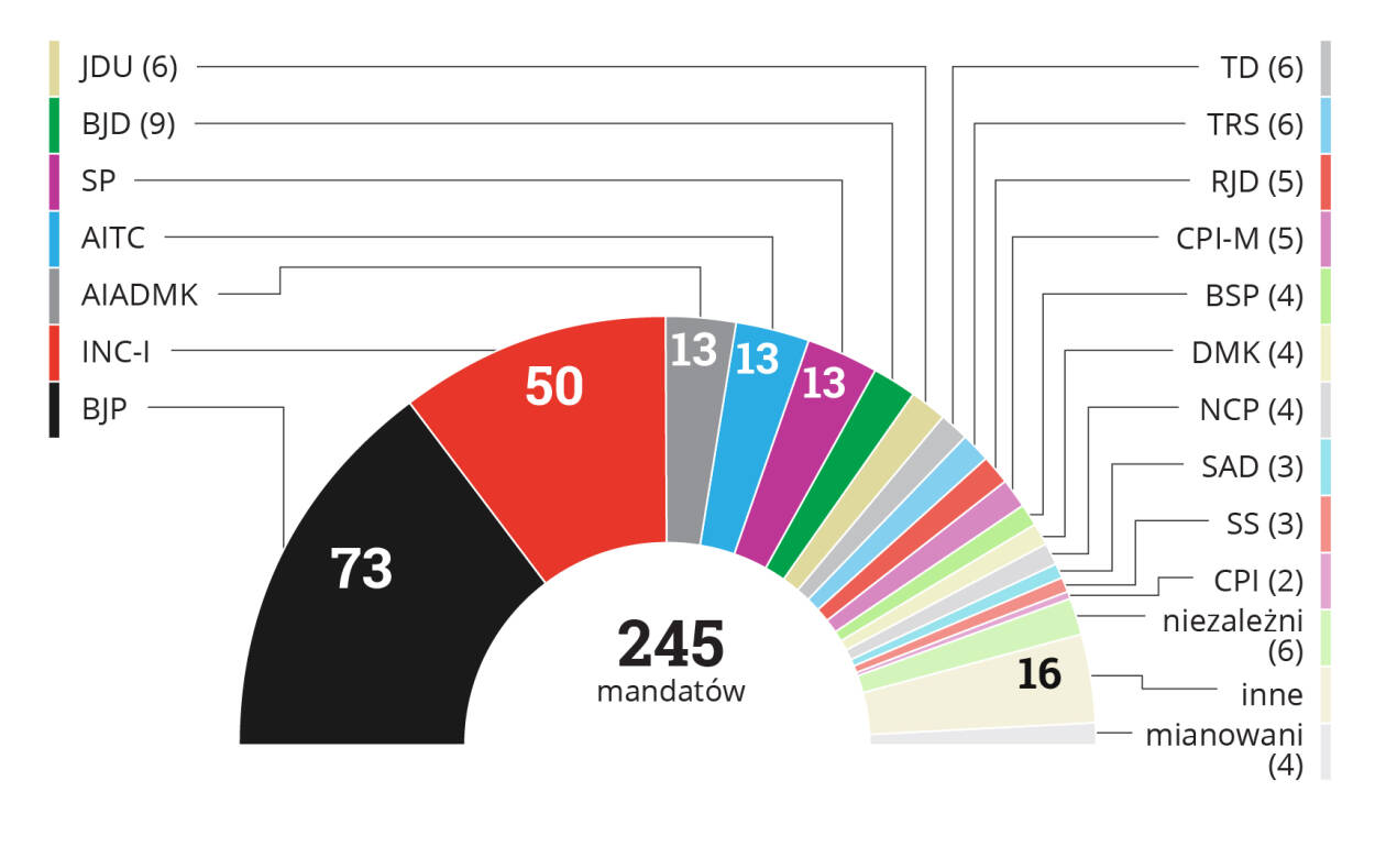 Podział mandatów, stan z 1 stycznia 2019 r.: BJP 73, INC-I 50, AIADMK 13, AITC 13, SP 13, BJD 9, JDU 6, TD 6, TRS 6, RJD 5, CPI-M 5, BSP 4, DMK 4, NCP 4, SAD 3, SS 3, CPI 2, niezależni 6, inne 16, mianowani 4. Razem 245.