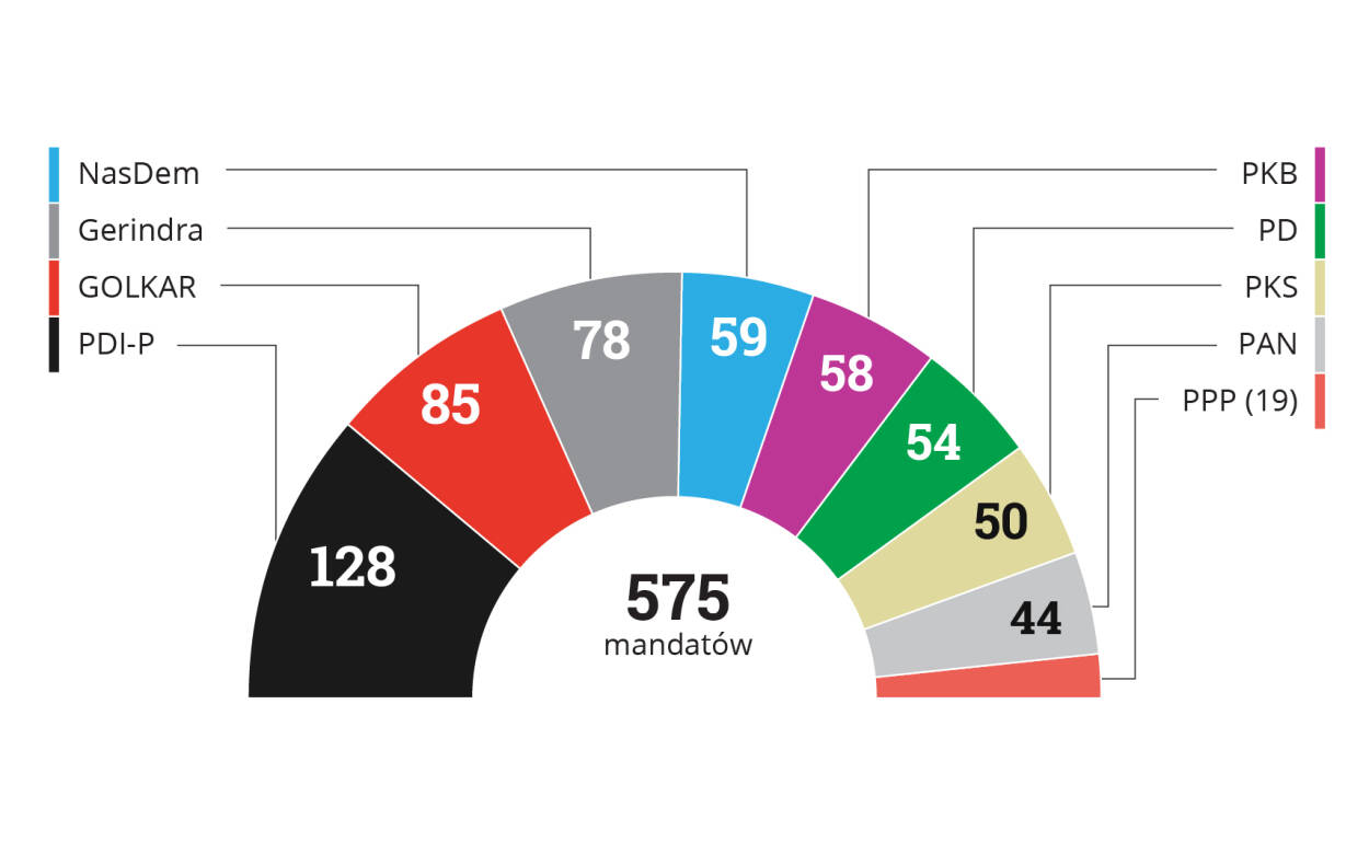 Podział mandatów w Ludowej Izbie Reprezentantów po wyborach z 17 kwietnia 2019 r.: PDI-P 128, GOLKAR 85, Gerindra 78, NasDem 59, PKB 58, PD 54, PKS 50, PAN 44, PPP 19. Razem 575.