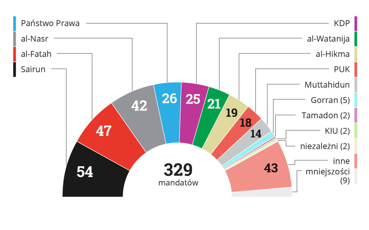Podział mandatów po wyborach z 12 maja 2018 r.: Sairun 54, al-Fatah 47, al-Nasr 42, Państwo Prawa 26, KDP 25, al-Watanija 21, al-Hikma 19, PUK 18, Muttahidun 14, Gorran 5, Tamadon 2, KIU 2,niezależni 2, inne 43, mniejszości 9. Razem 329.