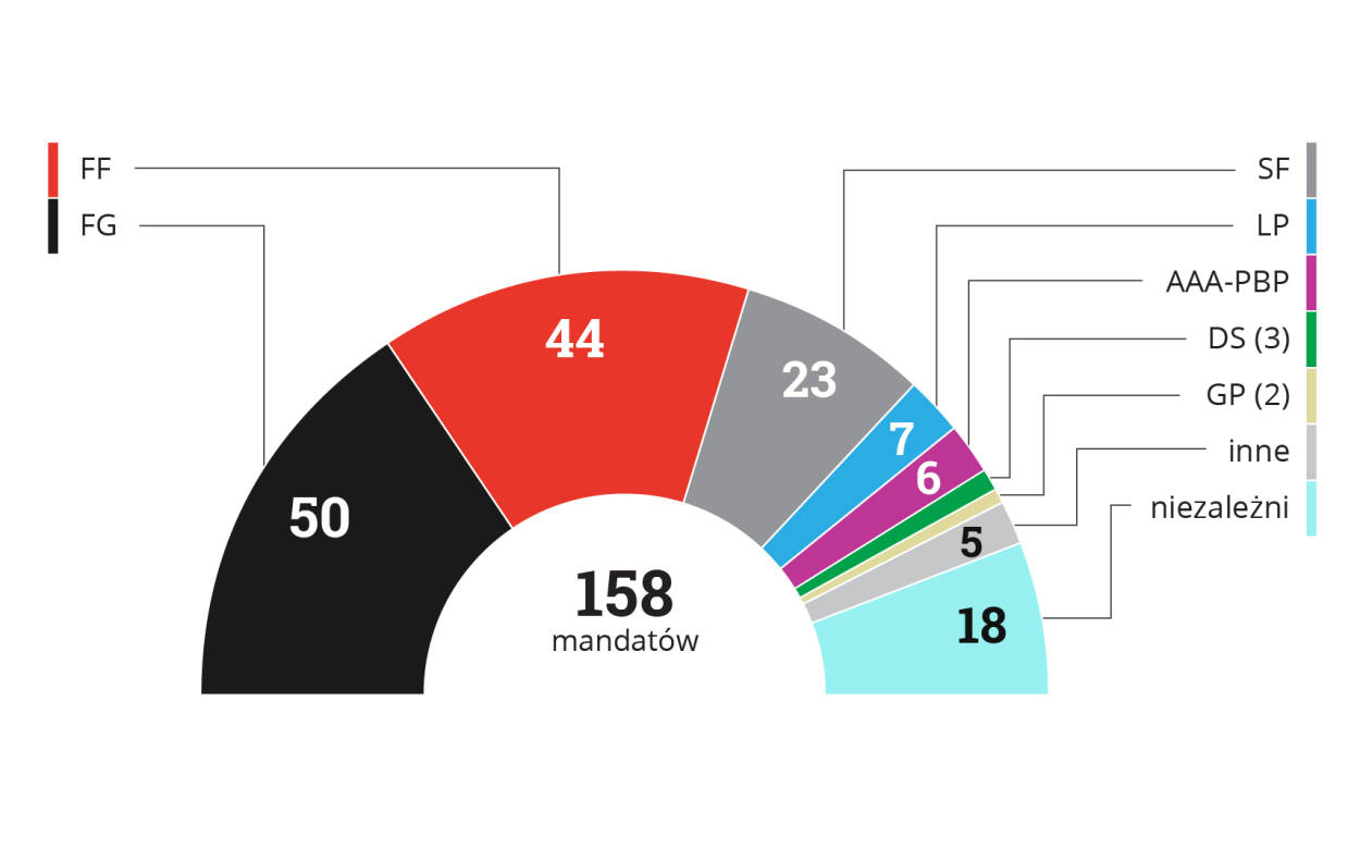 Podział mandatów po wyborach z 26 lutego 2016 r.: FG 50, FF 44, SF 23, LP 7, AAA-PBP 6, DS 3, GP 2, inne 5, niezależni 18. Razem 158.