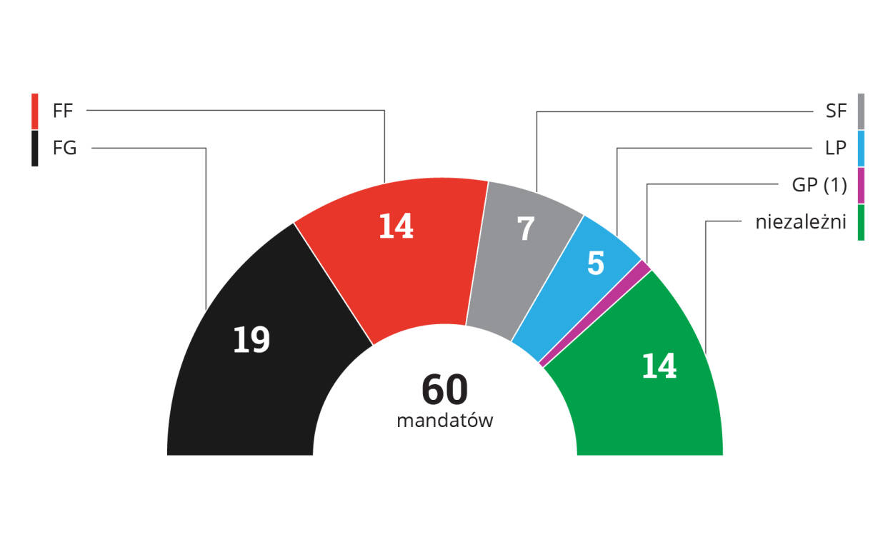 Podział mandatów po wyborach z 25 i 26 kwietnia 2016 r.: FG 19, FF 14, SF 7, LP 5, GP 1, niezależni 14. Razem 60.