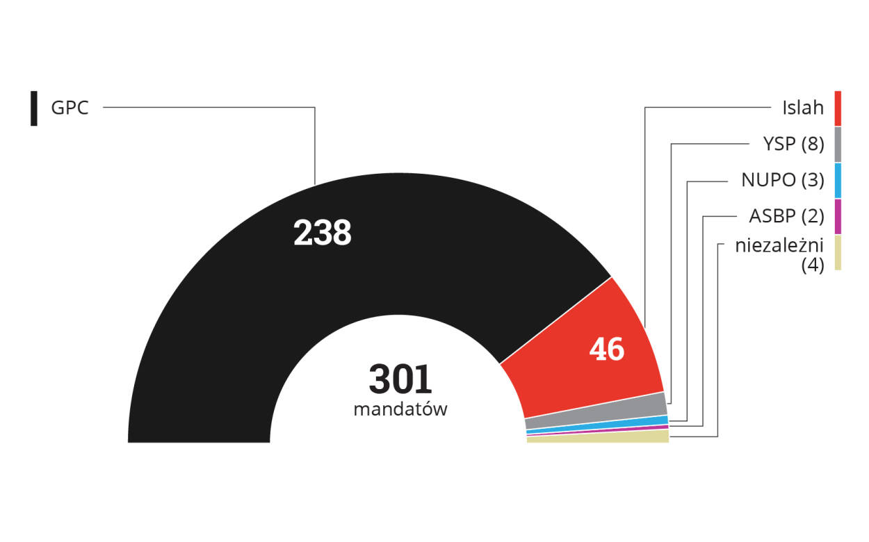 Podział mandatów po wyborach z 27 kwietnia 2003 r.: GPC 238, Islah 46, YSP 8, NUPO 3, ASBP 2, niezależni 4. Razem 301.