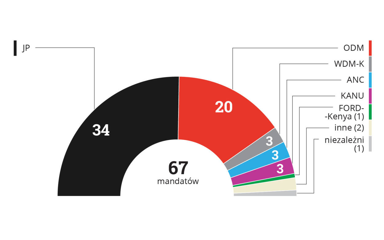 Podział mandatów po wyborach z 8 sierpnia 2017 r.: JP 34, ODM 20, WDM-K 3, ANC 3, KANU 3, FORD-Kenya 1, inne 2, niezależni 1. Razem 67.