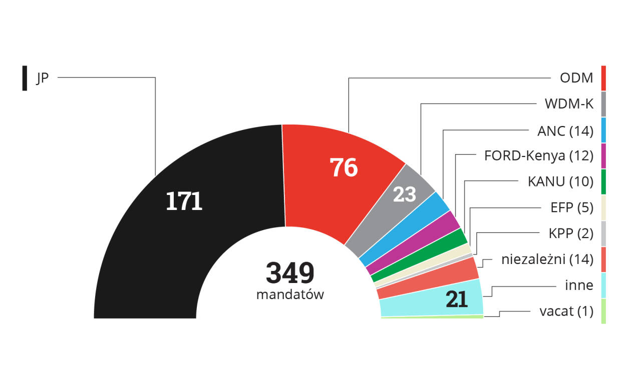 Podział mandatów po wyborach z 8 sierpnia 2017 r.: JP171, ODM 76, WDM-K 23, ANC 14, FORD-Kenya 12, KANU 10, EFP 5, KPP 2, niezależni 14, inne 21, vacat 1. Razem 349.