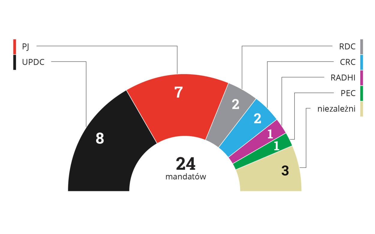 Podział mandatów po wyborach z 25 stycznia i 22 lutego 2015 r.: UPDC 8, PJ 7, RDC 2, CRC 2, RADHI 1, PEC 1, niezależni 3. Razem 24.