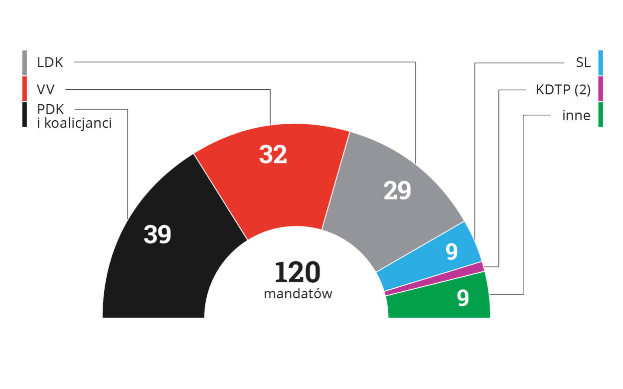 Podział mandatów po wyborach z 11 czerwca 2017 r.: PDK i koalicjanci 39, VV 32, LDK 29, SL 9, KDTP 2, inne 9. Razem 120.