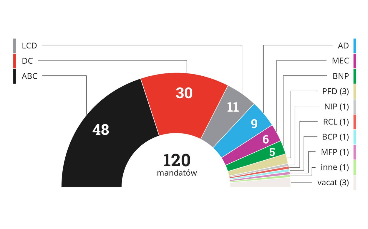 Podział mandatów po wyborach z 3 czerwca 2017 r.: ABC 48, DC 30, LCD 11, AD 9, MEC 6, BNP 5, PFD 3, NIP 1, RCL 1, BCP 1, MFP 1, inne 1, vacat 3. Razem 120.