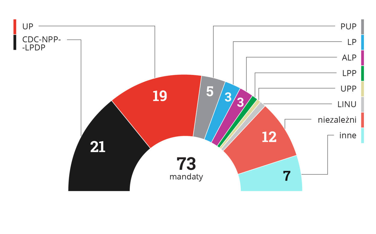 Podział mandatów po wyborach z 10 października 2017 r.: CDC-NPP-LPDP 21, UP 19, PUP 5, LP 3, ALP 3, LPP 1, UPP 1, LINU 1, niezależni 12, inne 7. Razem 73.