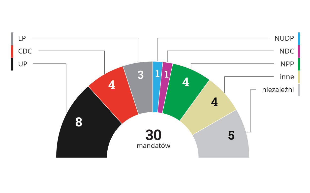 Podział mandatów po wyborach z 20 grudnia 2014 r.: UP 8, CDC 4, LP 3, NUDP 1, NDC 1, NPP 4, inne 4, niezależni 5. Razem 30.