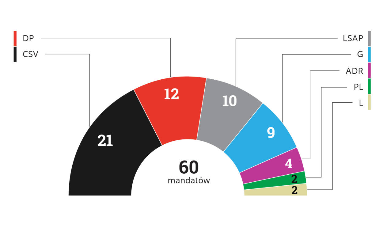Podział mandatów po wyborach z 14 października 2018 r.: CSV 21, DP 12, LSAP 10, G 9, ADR 4, PL 2, L 2. Razem 60.