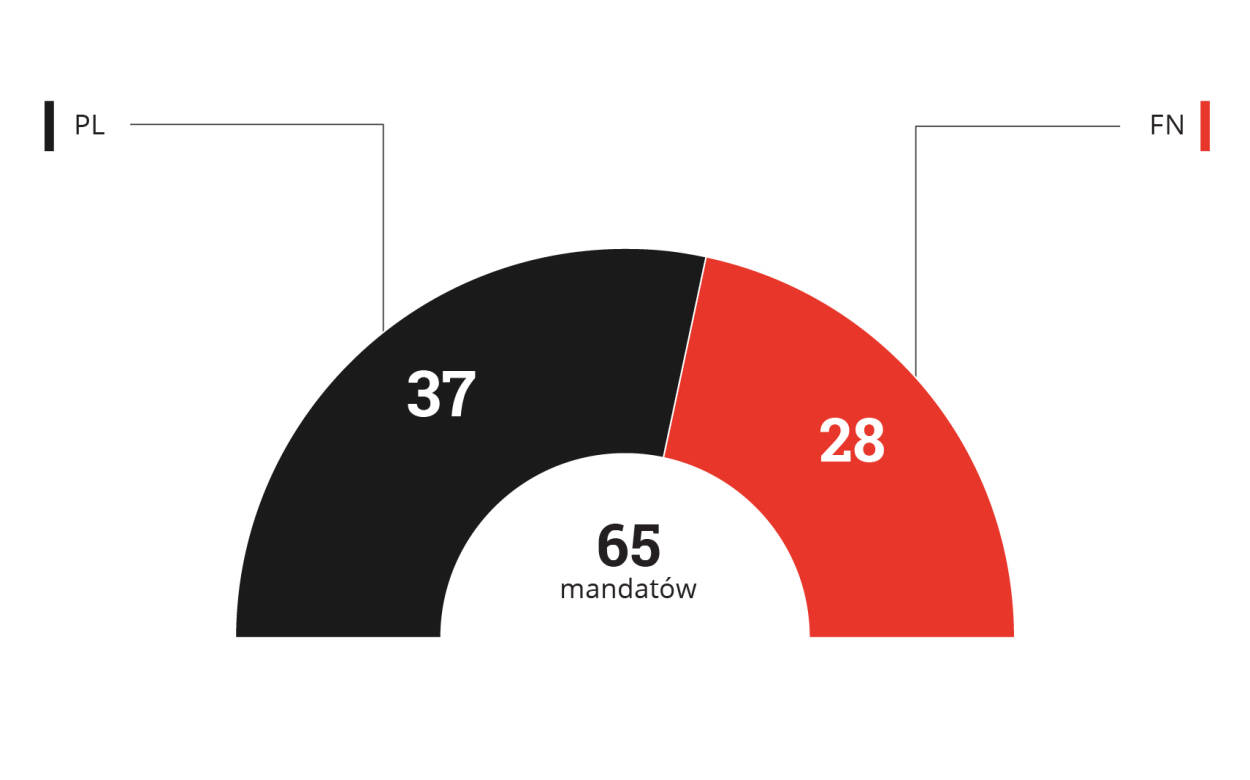 Podział mandatów po wyborach z 3 czerwca 2017 r.: PL 37, FN 28. Razem 65.