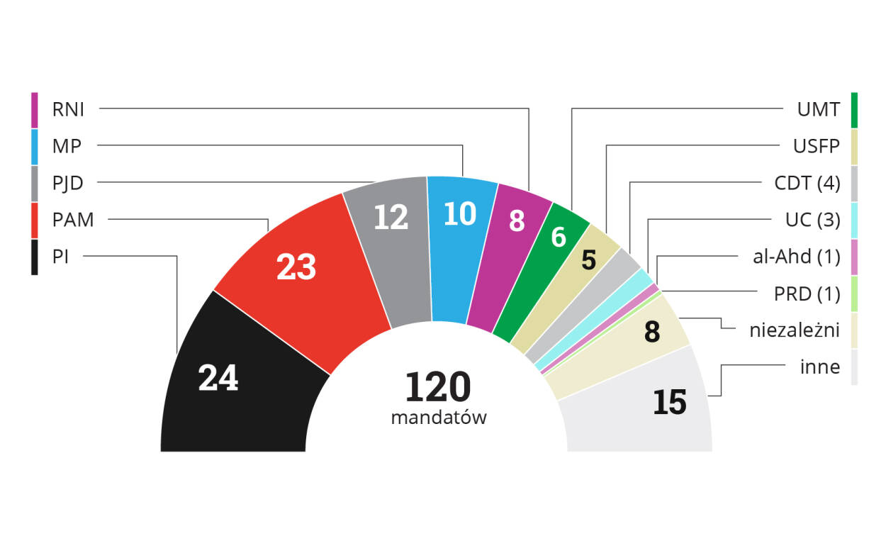 Podział mandatów po wyborach częściowych z 2 października 2015 r.: PI 24, PAM 23, PJD 12, MP 10, RNI 8, UMT 6, USFP 5, CDT 4, UC 3, al-Ahd 1, PRD 1, niezależni 8, inne 15. Razem 120.