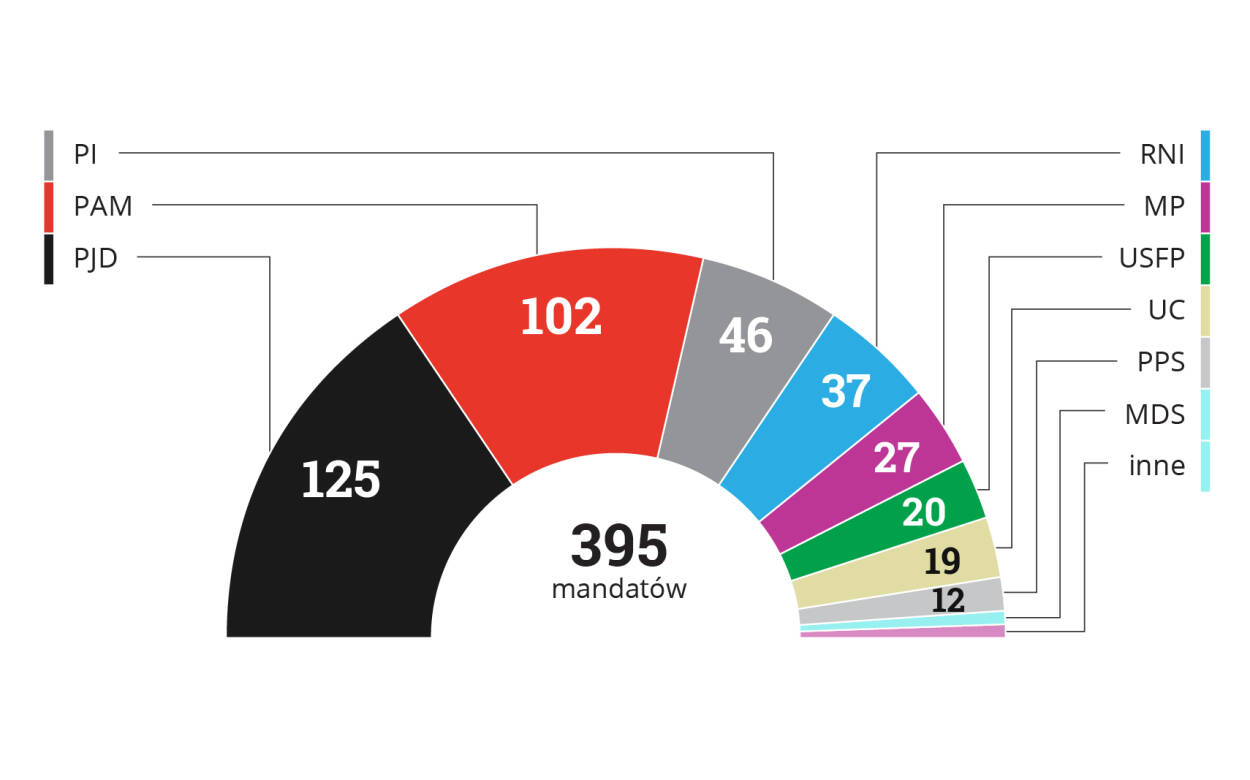 Podział mandatów po wyborach z 7 października 2016 r.: PJD 125, PAM 102, PI 46, RNI 37, MP 27, USFP 20, UC 19, PPS 12, MDS 3, inne 4. Razem 395.