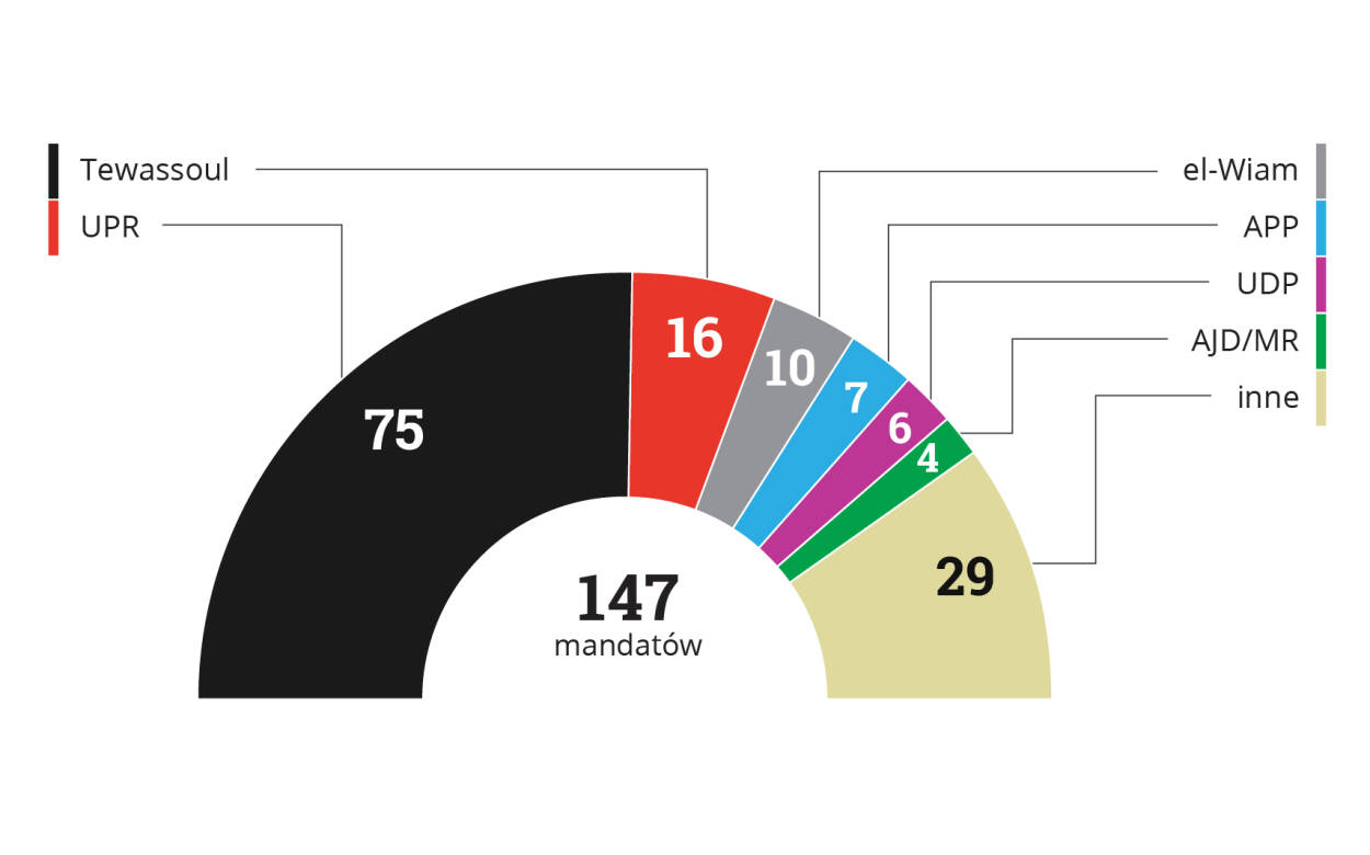 Podział mandatów po wyborach do Zgromadzenia Narodowego z 1 i 15 września 2018 r.: UPR 97, Tewassoul 14, UDP 6, inne 40. Razem 157.
