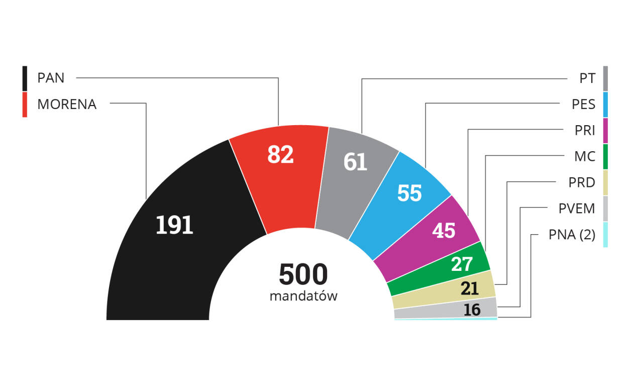 Podział mandatów po wyborach z 1 lipca 2018 r.: MORENA 191, PAN 82, PT 61, PES 55, PRI 45, MC 27, PRD 21, PVEM 16, PNA 2. Razem 500.
