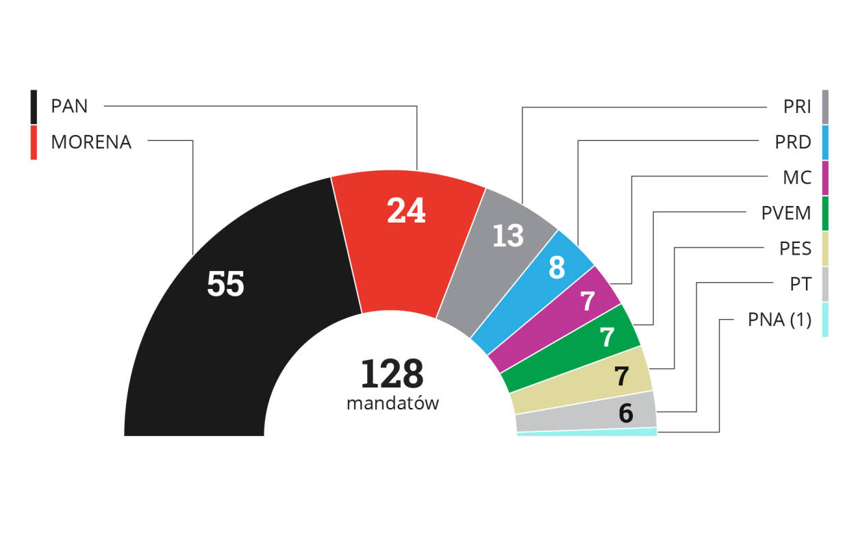 Podział mandatów po wyborach z 1 lipca 2018 r.: MORENA 55, PAN 24, PRI 13, PRD 8, MC 7, PVEM 7, PES 7, PT 6, PNA 1. Razem 128.