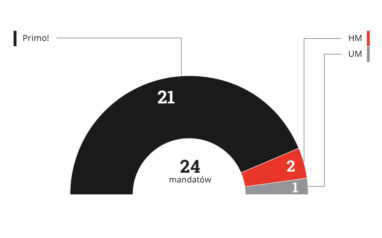 Podział mandatów po wyborach z 11 lutego 2018 r.: Primo! 21, HM 2, UM 1. Razem 24.