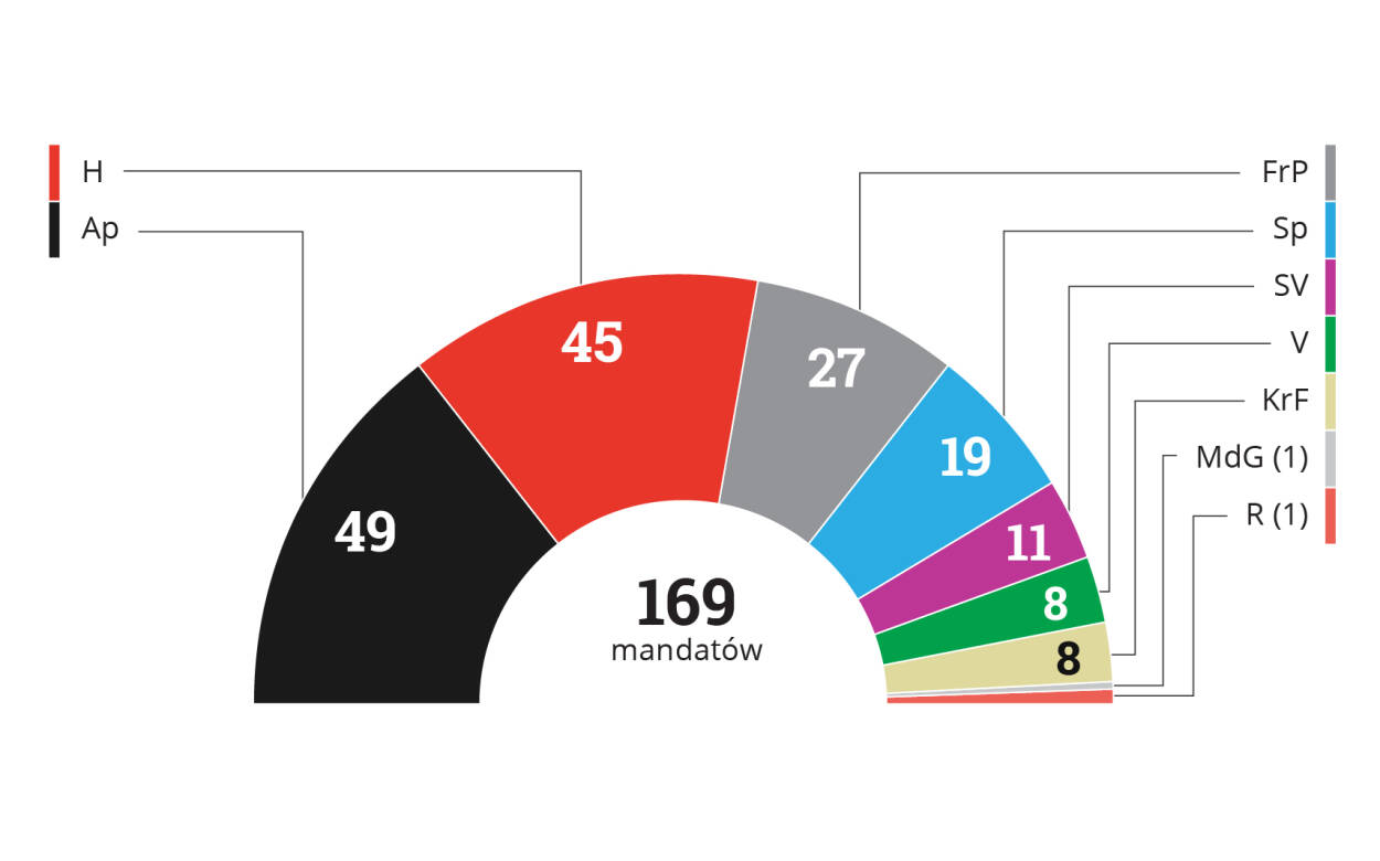 Podział mandatów po wyborach z 11 września 2017 r.: Ap 49, H 45, FrP 27, Sp 19, SV 11, V 8, KrF 8, MdG 1, R 1. Razem 169.