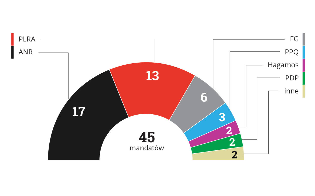 Podział mandatów w Izbie Deputowanych po wyborach z 22 kwietnia 2018 r.: ANR 42, PLRA 30, PPQ 3, PEN 2, Hagamos 2, inne 1. Razem 80.