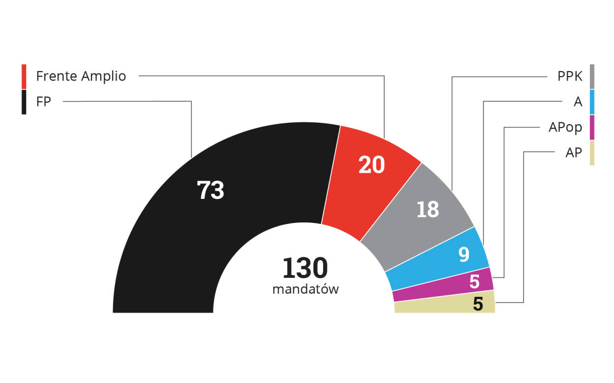 Podział mandatów po wyborach z 10 kwietnia 2016 r.: FP 73, Frente Amplio 20, PPK 18, A 9, APop 5, AP 5. Razem 130.