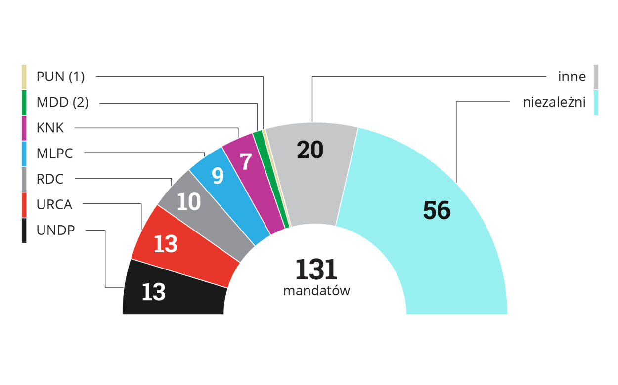 Podział mandatów po wyborach z 14 lutego i 31 marca 2016 r.: UNDP 13, URCA 13, RDC 10, MLPC 9, KNK 7, MDD 2, PUN 1, inne 20, niezależni 56. Razem 131.