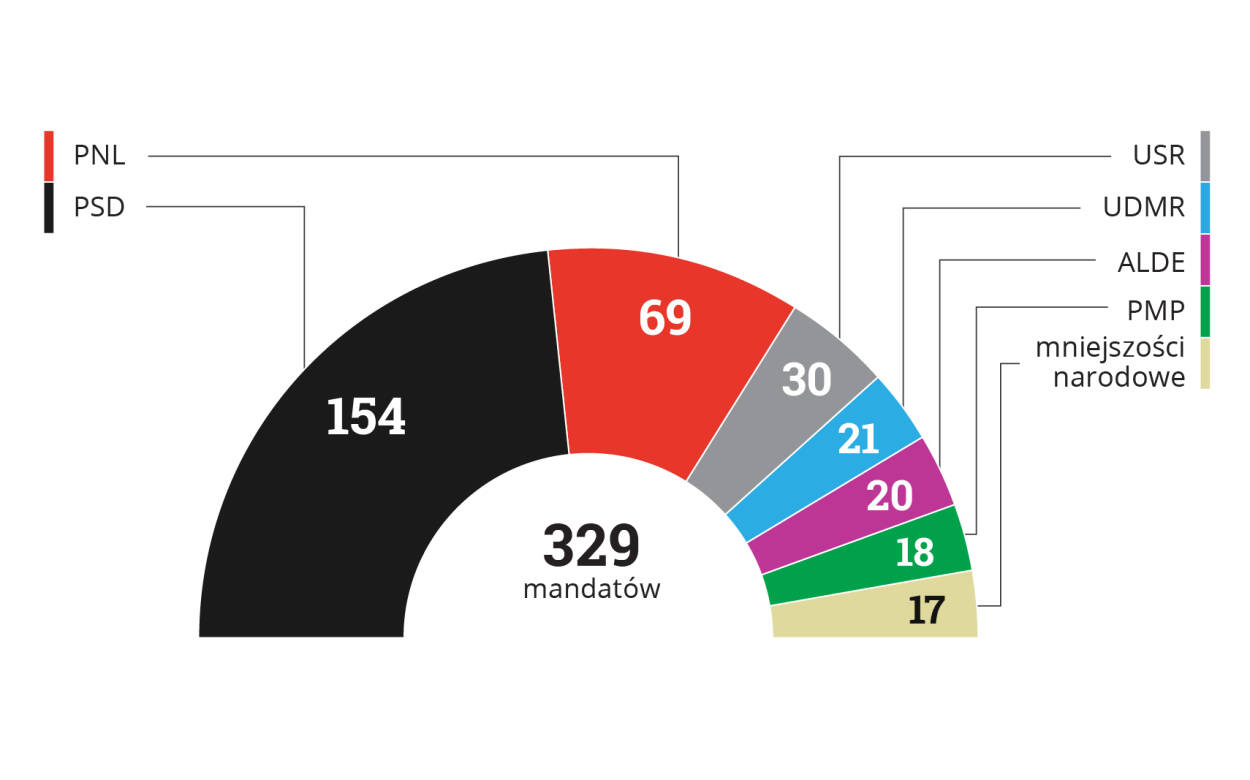 Podział mandatów po wyborach z 11 grudnia 2016 r.: PSD 154, PNL 69, USR 30, UDMR 21, ALDE 20, PMP 18, mniejszości narodowe 17. Razem 329.