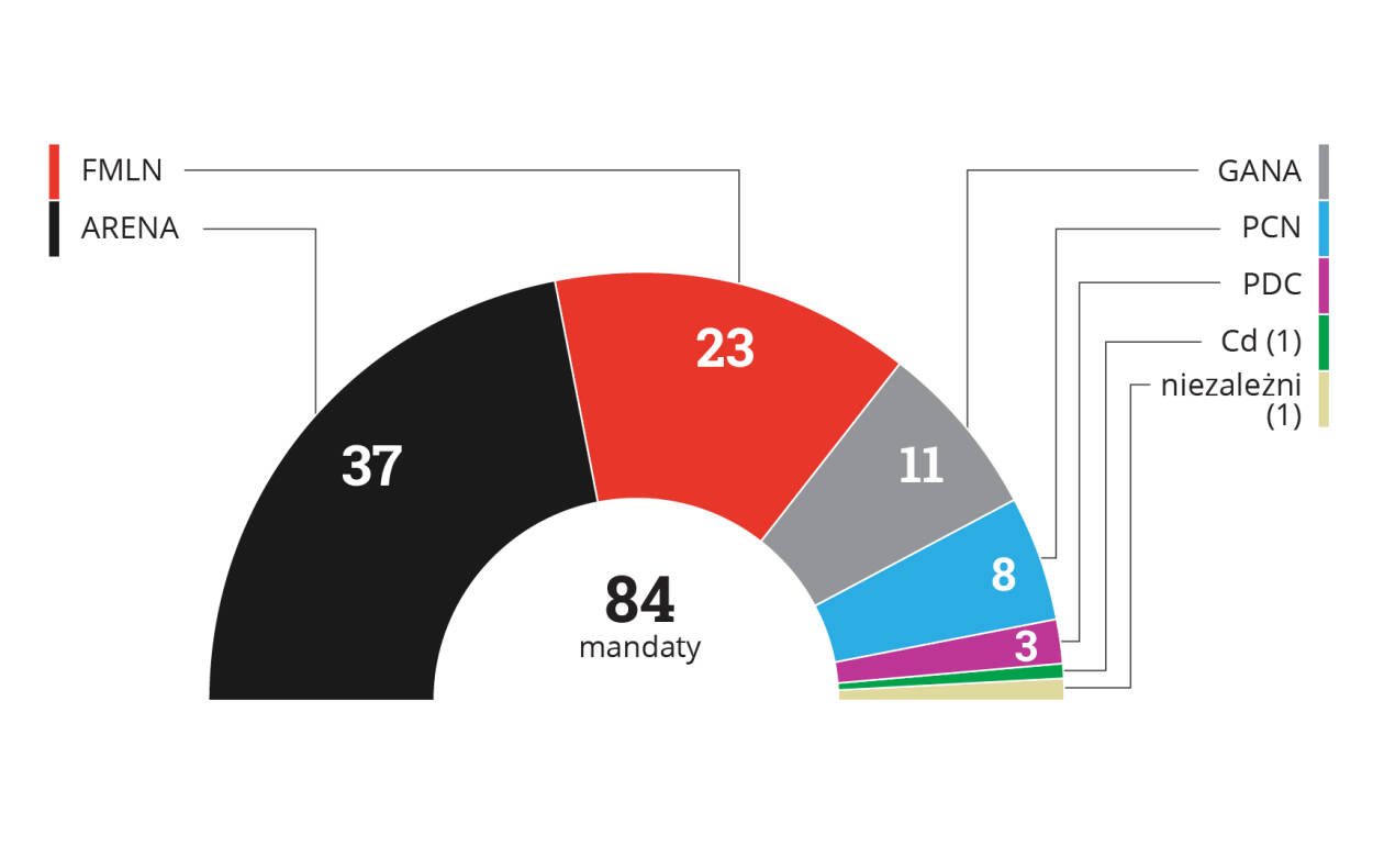 Podział mandatów po wyborach z 4 marca 2018 r.: ARENA 37, FMLN 23, GANA 11, PCN 8, PDC 3, CD 1, niezależni 1. Razem 84.