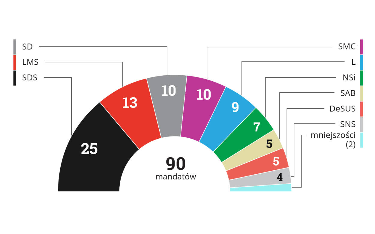 Podział mandatów po wyborach z 3 czerwca 2018 r.: SDS 25, LMS 13, SD 10, SMC 10, L 9, NSi 7, SAB 5, DeSUS 5, SNS 4, mniejszość włoska i węgierska 2. Razem 90.