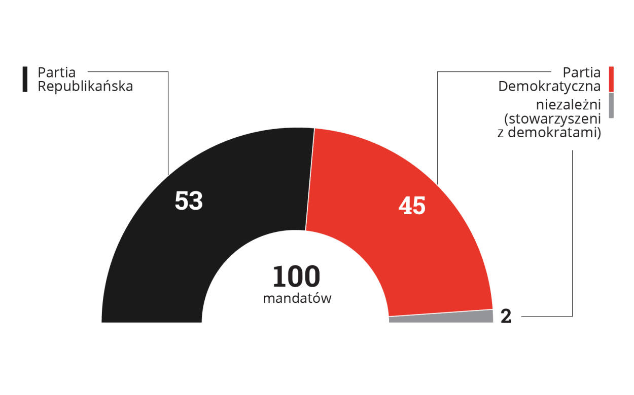 Podział mandatów po wyborach z 6 listopada 2018 r.: Partia Republikańska 53, Partia Demokratyczna 45, niezależni (stowarzyszeni z demokratami) 2. Razem 100.