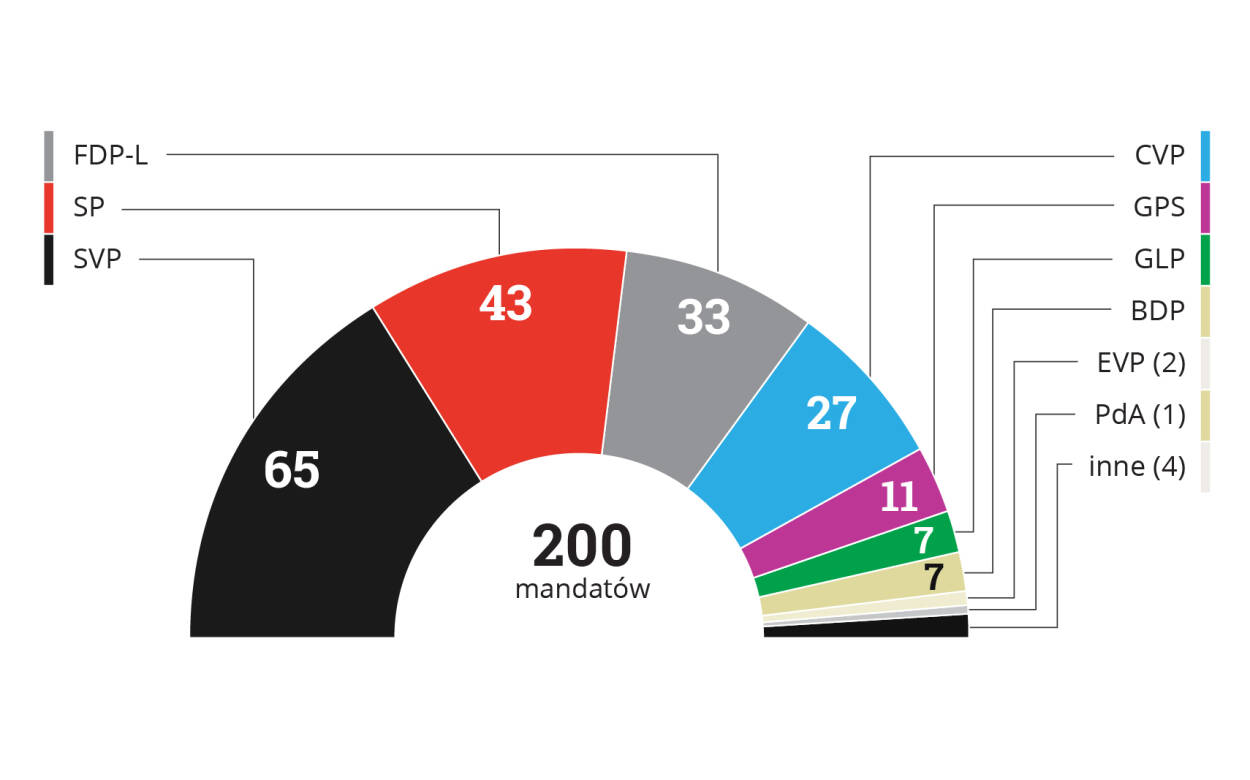 Podział mandatów w Radzie Narodowej po wyborach z 18 października 2015 r.: SVP 65, SP 43, FDP-L 33, CVP 27, GPS 11, GLP 7, BDP 7, EVP 2, PdA 1, inne 4. Razem 200.