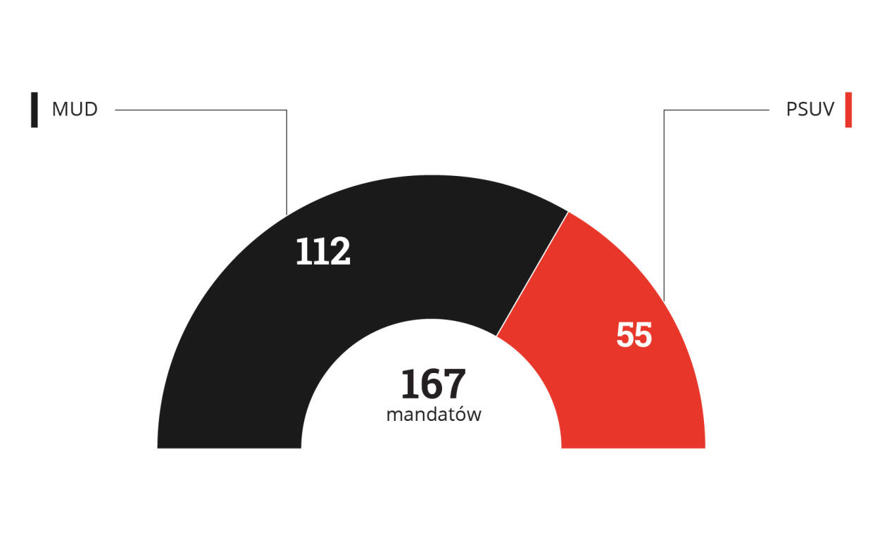 Podział mandatów po wyborach z 6 grudnia 2015 r.: MUD 112, PSUV 55. Razem 167.