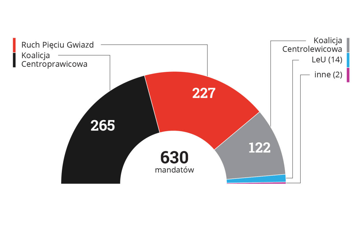 Podział mandatów po wyborach z 4 marca 2018 r.: Koalicja Centroprawicowa 265 (LN 126, FI 101, FdI 33, inni 5), Ruch Pięciu Gwiazd 227, Koalicja Centrolewicowa 122 (PD 117, inni 5), LeU 14, inne 2. Razem 630.