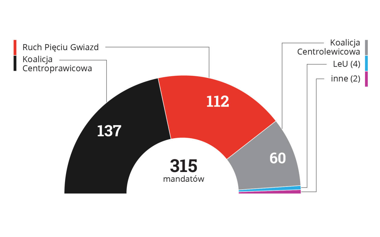 Podział mandatów po wyborach z 4 marca 2018 r.: Koalicja Centroprawicowa 137 (LN 57, FI 57, FdI 17, NcI 4, inni 2), Ruch Pięciu Gwiazd 112, Koalicja Centrolewicowa 60 (PD 54, inni 6), LeU 4, inne 2. Razem 315.
