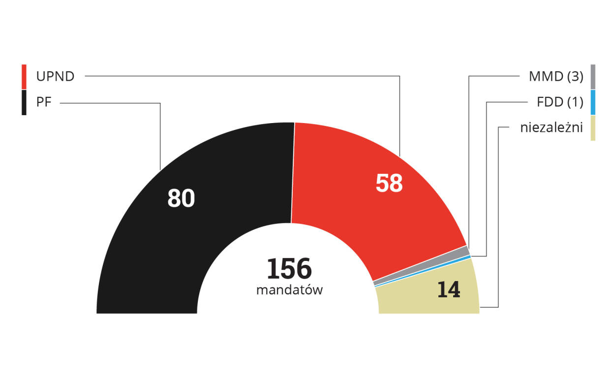 Podział mandatów po wyborach z 11 sierpnia 2016 r.: PF 80, UPND 58, MMD 3, FDD 1, niezależni 14. Razem 156.