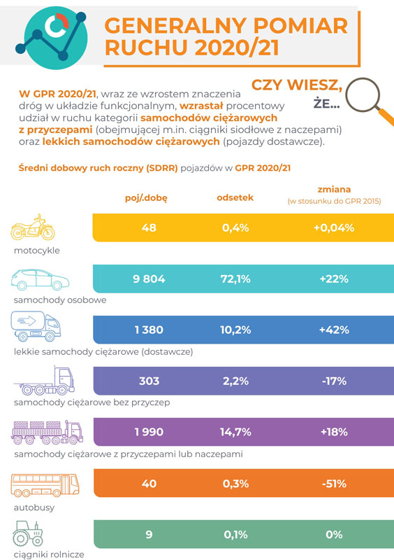 Wyniki GPR 2020/21 pokazały dużą koncentrację ruchu na wybranych drogach krajowych o długości 3680 km, z czego 2972 km to autostrady i drogi ekspresowe. Chociaż stanowią one tylko 20 proc. sieci dróg krajowych to przenosiły ponad 50 proc. pracy przewozowej na całej sieci dróg krajowych.