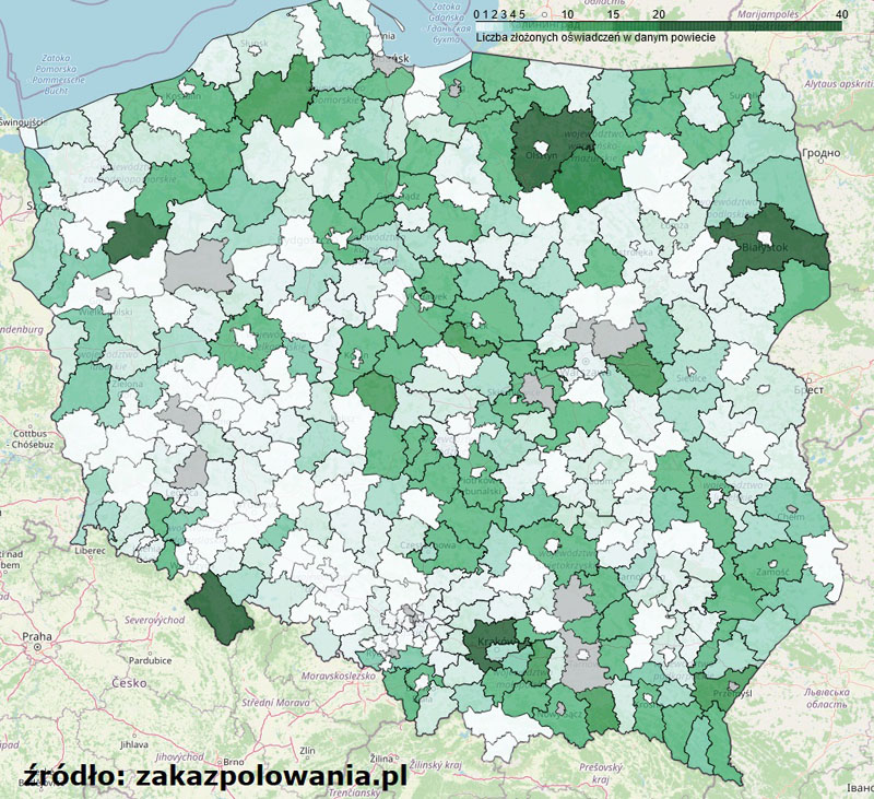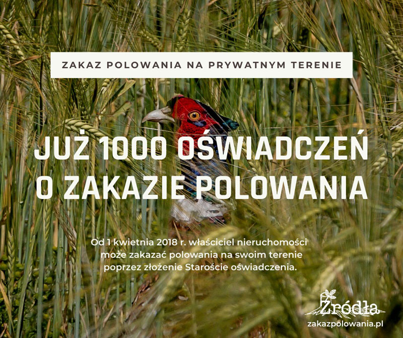 Organizacja ekologiczna „Źródła”, zajmująca się między innymi wsparciem prawnym i informacyjnym dla osób mających problemy z myśliwymi, zbadała ile takich oświadczeń złożono do tej pory. Z odpowiedzi na zapytania, które rozesłano do wszystkich starostw powiatowych w kraju wynika, że do tej pory złożono już 994 takie oświadczenia. W wielu powiatach jest ich po kilkanaście, ale są też powiaty, gdzie nie wpłynęło ani jedno takie oświadczenie. „Być może nie wszyscy jeszcze wiedzą o takiej możliwości - mówi Krzysztof Wychowałek z Ośrodka >>Źródła<<. - Dzwoni do nas bardzo dużo osób zaniepokojonych obecnością myśliwych na swojej posesji lub w jej bezpośrednim pobliżu. Informujemy ich o przysługujących im prawach. Warto też sprawdzać, czy urząd gminy prawidłowo informuje na swojej stronie internetowej o miejscach i terminach zaplanowanych polowań zbiorowych”.