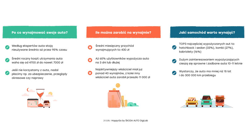 „Na wynajem niejednokrotnie przeznaczane jest drugie domowe auto, które często stoi w garażu. Co ciekawe, zauważyliśmy, że właściciele tych samochodów z reguły wynajmują je po bardzo atrakcyjnych stawkach, dzięki czemu użytkownicy chętnie z nich korzystają. Cena, która przyciąga wypożyczających, jest jednym z parametrów mających wpływ na wysokie zainteresowanie daną ofertą. Sprawia to, że dzięki HoppyGo właściciele aut mogą liczyć na naprawdę satysfakcjonujące zarobki” - komentuje Piotr Boguszewski, Country Manager HoppyGo Polska.