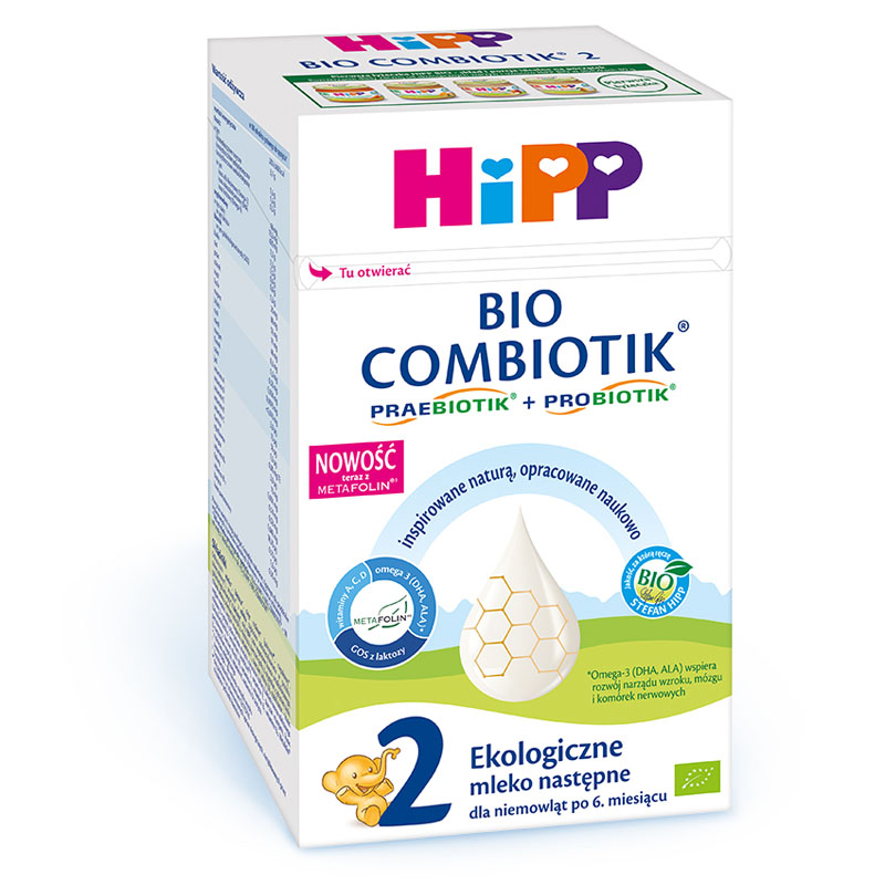 HiPP BIO COMBIOTIK® to pierwsza i jedyna na polskim rynku receptura ekologiczna z Praebiotik® i Probiotik® - naturalnymi kulturami kwasu mlekowego oraz Metafolin® - źródłem folianów na wzór mleka mamy. Produkt zapewnia idealną tolerancję dzięki szczególnie łagodnym składnikom ekologicznym.