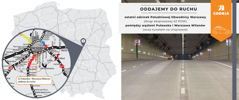 Od dziś kierowcy mogą korzystać z 4,6-kilometrowego odcinka drogi ekspresowej S2 pomiędzy węzłami Puławska i Warszawa Wilanów wraz z tunelem pod Ursynowem. To ostatni zrealizowany fragment trasy S2 Południowej Obwodnicy Warszawy, której długość obecnie wynosi ok. 33 km. Inwestycja ta jest ważna nie tylko dla mieszkańców Warszawy ze względu na ułatwienie komunikację między dzielnicami. To przede wszystkim uzupełnienie ciągu dla kierowców przemieszczających się tranzytem na osi wschód-zachód autostradą A2.