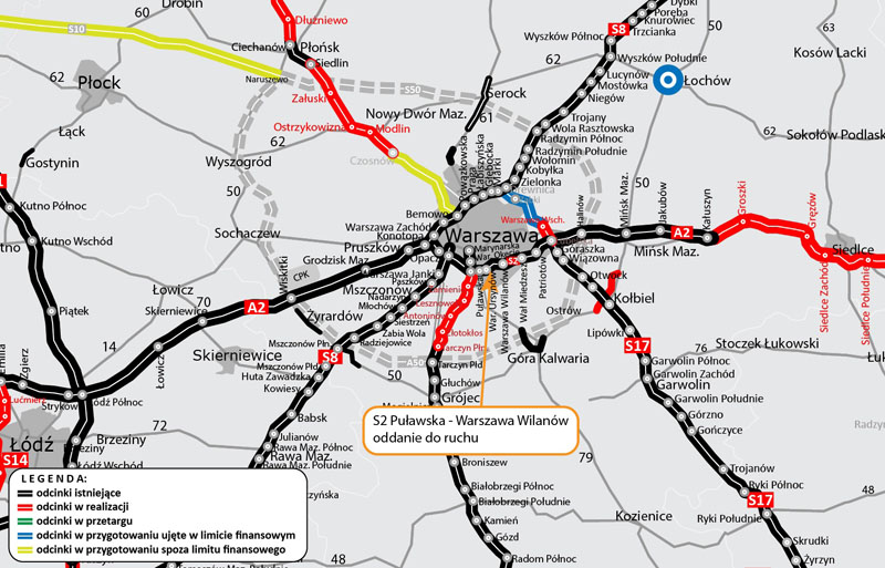 W 2013 roku oddaliśmy do ruchu dwa odcinki trasy S2 od węzła Konotopa do węzła Warszawa Lotnisko i kolejny do węzła Puławska wraz z łącznikiem S79 do węzła Marynarska. Od grudnia ubiegłego roku kierowcy mają do dyspozycji kolejne dwa odcinki (ok. 14 km) od węzła Warszawa Wilanów do węzła Lubelska, łączące brzegi Wisły i autostradę A2 po wschodniej stronie Warszawy.
