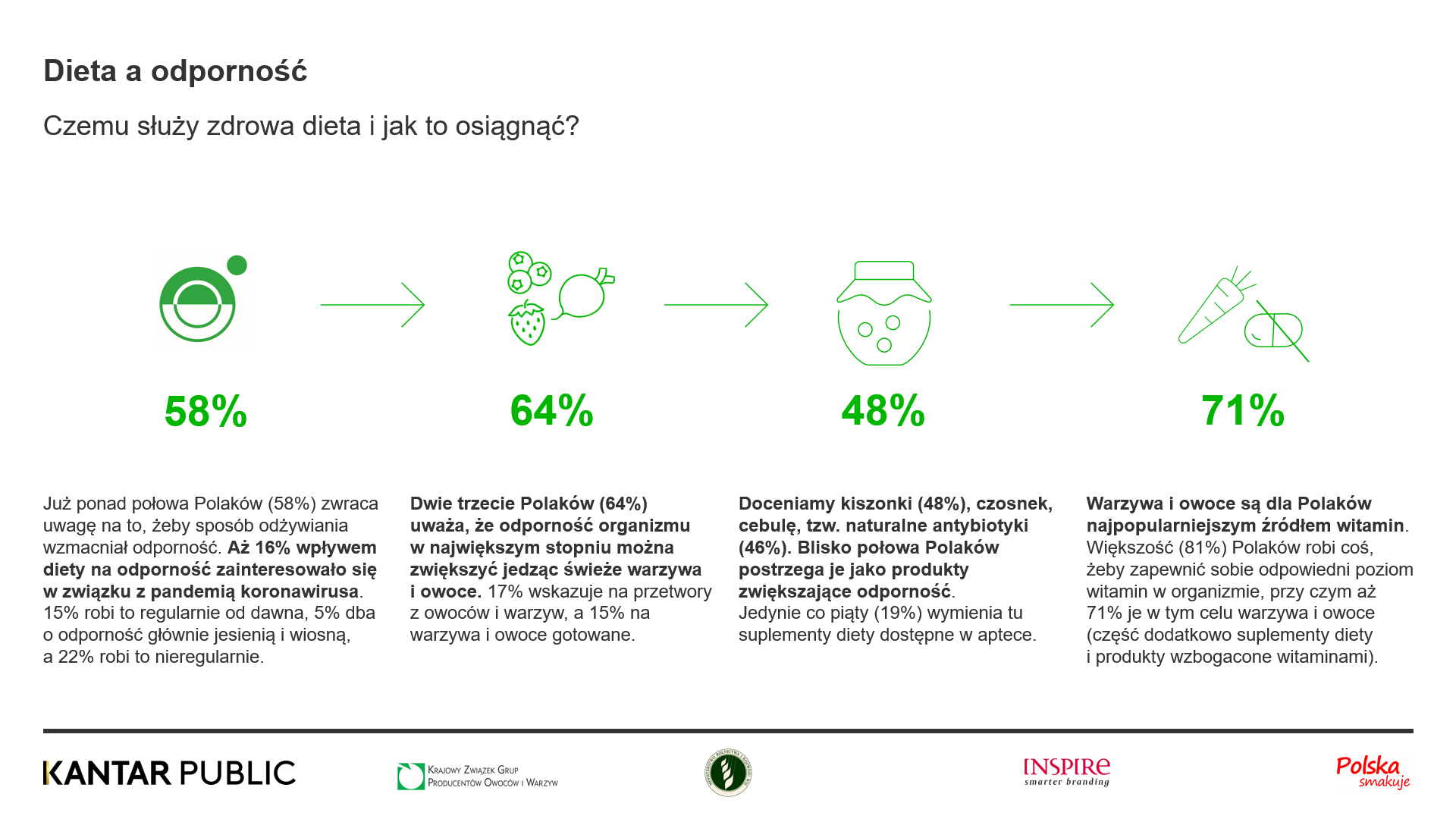 Dawniej „chcieliśmy być sobą”, dziś dodajemy „i chcemy żyć zdrowo”. Pandemia skokowo zwiększyła świadomość prozdrowotną. Ponad połowa Polaków (58%) zwraca uwagę na to, żeby sposób odżywiania wzmacniał odporność. Co ciekawe, aż 16% ankietowanych wpływem diety na zdrowie zainteresowało się w związku z pandemią. Dziś trzech na pięciu Polaków chciałoby dziś zmienić swoją dietę i jeść więcej owoców i warzyw. Większość (64%) uważa, że właśnie ich spożywanie w największym stopniu zwiększa nasze zdrowie i odporność. Samych owoców więcej chce jeść 38% konsumentów.