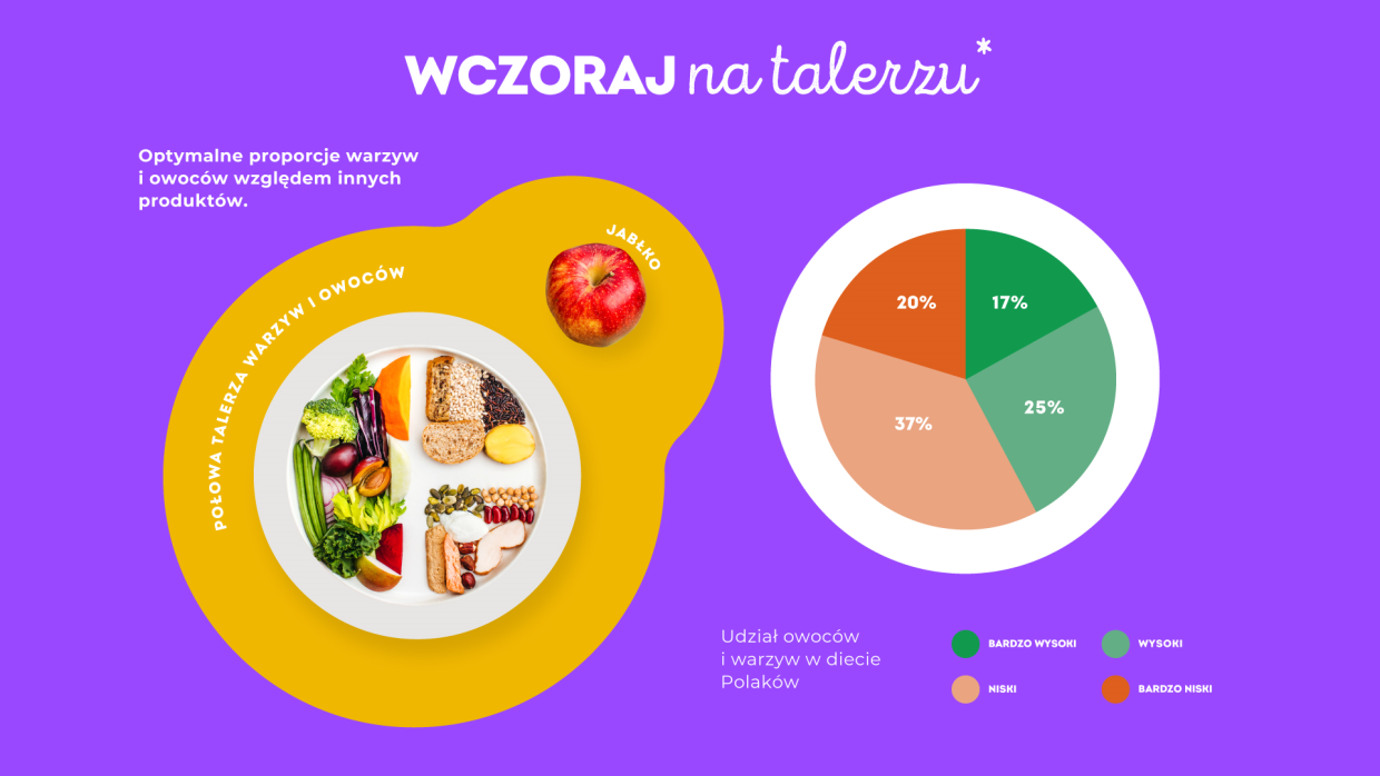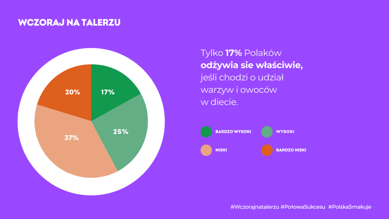 W 2021 roku jedynie 17% Polaków odżywiało się zgodnie z zaleceniami dietetyków - połowę każdego ich posiłku stanowiły warzywa i owoce. 57% Polaków ma dietę zbyt ubogą w warzywa i owoce. U 37% pojawiały się one w przynajmniej połowie posiłków (choć to za mało). 20% badanych jadło bardzo mało warzyw i owoców, a nawet nie jadło ich wcale.
