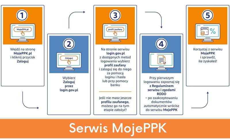 Do serwisu MojePPK można zalogować się poprzez stronę mojeppk.pl lub bezpośrednio pod adresem: www.rachunek.mojeppk.pl. Logowanie jest możliwe poprzez profil zaufany (czyli na przykład przez bankowość elektroniczną) lub za pomocą utworzonego w serwisie konta. Portal ma charakter wyłącznie informacyjny i nie pozwala na składanie żadnych dyspozycji, związanych z oszczędnościami. Co zatem znajdziemy w serwisie MojePPK?