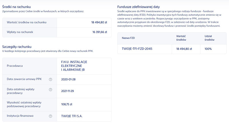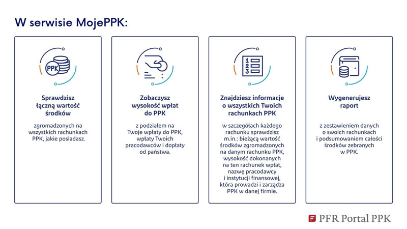 „Przede wszystkim informacje o posiadanych rachunkach PPK, z podaniem nazw pracodawców oraz instytucji finansowych, zarządzających PPK w danych firmach. W szczegółach każdego rachunku można sprawdzić bieżącą wartość zgromadzonych środków oraz wysokość dokonanych wpłat, z podziałem na wpłaty pracownika, pracodawcy i dopłaty państwa. Serwis zawiera także informacje o wypłatach lub zwrotach z rachunku, o ile takie miały miejsce. Pozwala również na wygenerowanie raportu z zestawieniem danych o rachunkach oraz podsumowaniem całości środków zebranych w PPK” - wyjaśnia Małgorzata Smołkowska, członek zarządu PFR Portal PPK.