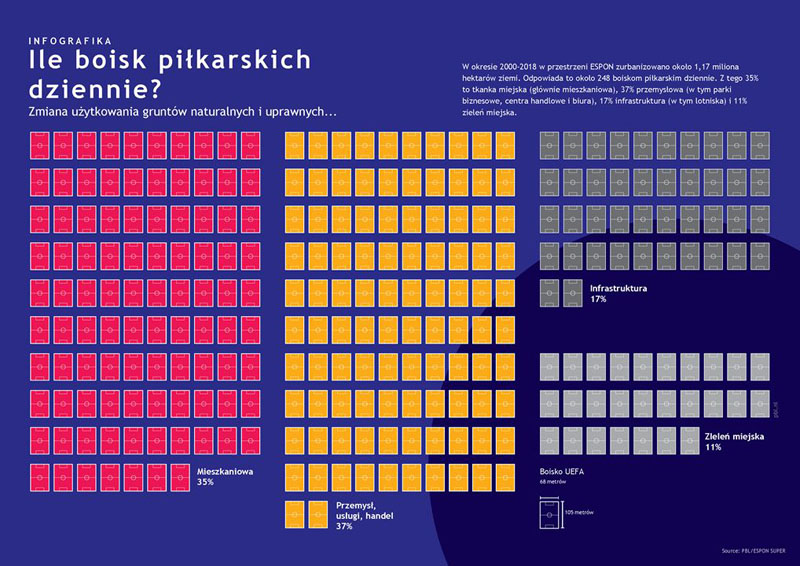 „Nasz kraj intensywnie się zabudowuje, zarówno w odniesieniu do punktu startowego (nadrabiamy zaległości z okresu PRL), jak i w relacji do innych państw Wspólnoty. W badanym okresie lat 2000-2018, Polska stanowiła trzeci kraj w całej UE pod względem intensywności procesu urbanizacyjnego. Na niektórych obszarach, zwłaszcza wokół największych polskich miast, proces ten osiągał tempo ponad 20 tys. m2 dziennie” – tłumaczy dr Katarzyna Wojnar, wieloletnia koordynatorka Krajowego Punktu Kontaktowego ESPON.